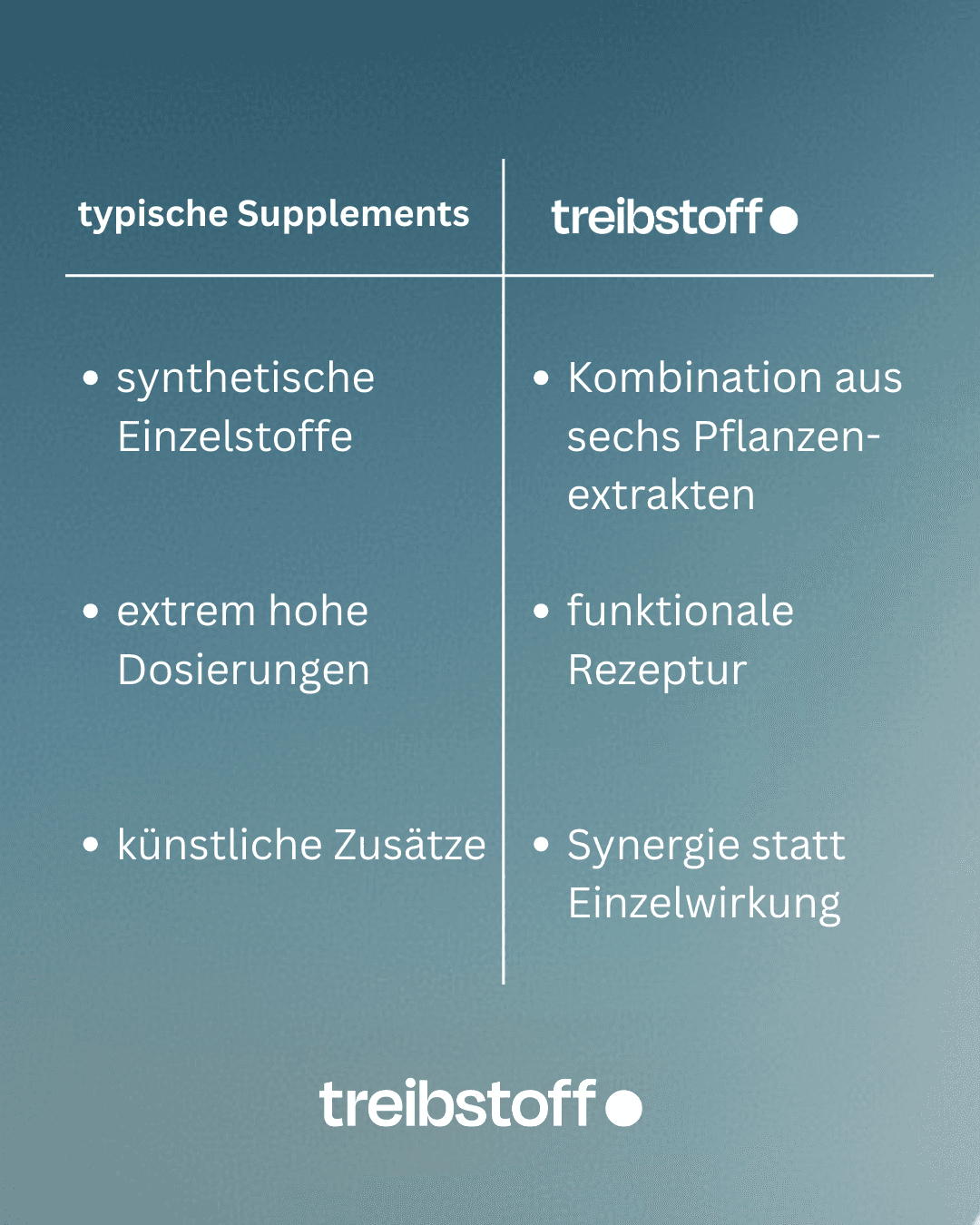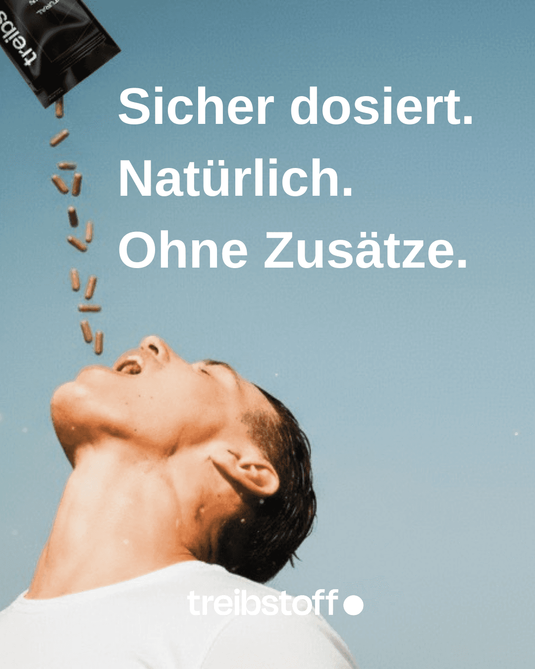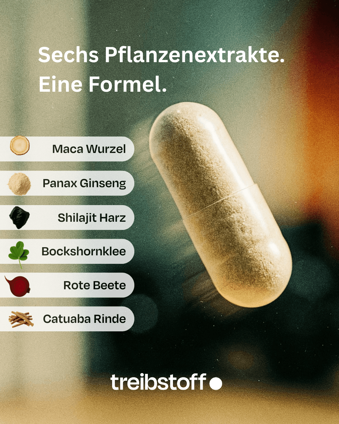 treibstoff. verbindet traditionelle Pflanzenkraft mit moderner Ernährungsmedizin. Für die natürliche Kraft im Mann. Die Rezeptur kombiniert sechs hochkonzentrierte Pflanzenextrakte mit bioverfügbarem Zink. Entwickelt als gezielte Ergänzung eines aktiven Lebensstils. Keine synthetischen Stimulanzien. Keine kurzfristigen Effekte. Keine Überdosierungen. Zwei Kapseln täglich genügen. Hergestellt in Deutschland.